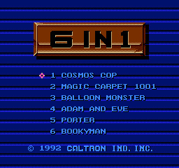 Caltron 6 in 1 (later re-released as Myriad 6 in 1) is an unlicensed multicart made by Caltron (aka NTDEC) and released in 1992, featuring 6 games previously released stand-alone by NTDEC.