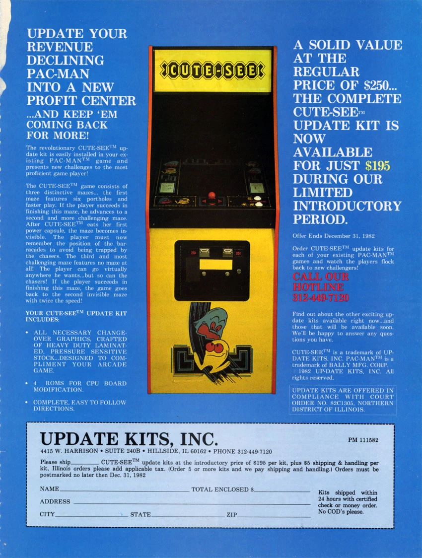 Cute-See is a relatively unknown hack of Pac-Man released by Update Kits Inc. in 1982. Little is known about the hack, but from the flyer describes the game as an advanced hack of Pac-Man similar to Joyman and possibly built off a version of Hangly-Man. The maze now features 6 exit holes, eating a power pellet makes the maze disappear, and some levels don't have a maze.
