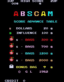 Abscam is a Pac-Man hack based on the FBI's controversial Abscam sting operation. It was developed by GL and published by U.S. Billiards in 1982. The game itself is directly based on their previous hack of Pac-Man, Piranha, released a year prior.