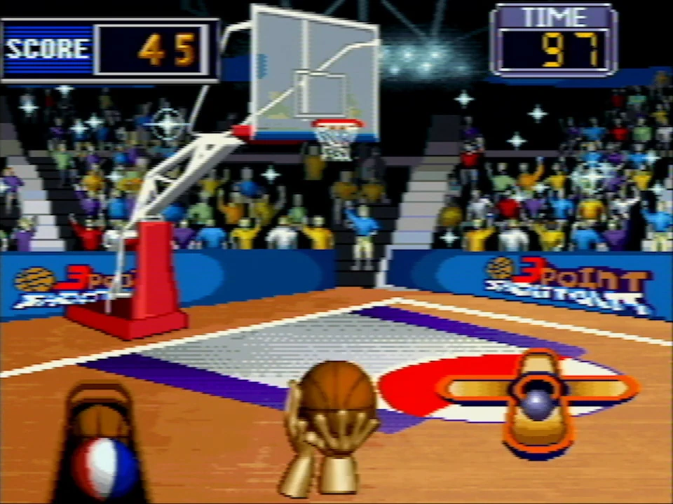 Timing-based basketball game where the player has to score as many baskets as possible. It is notable for extensively using pre-rendered 3D graphics, with the only other 16-bit Nice Code TV game known to utilize them being Kungfu. Named "3-Point Shot" on the Sports Game 7 in 1's menu.