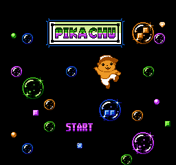 Pikachu, also referred to as "Pikachu5", is a Pokémon-themed platforming-adventure game. The player controls five characters, each of which have different abilities: Pikachu can shoot, Nuzleaf can climb, Combusken can fly, Marshtomp can swim, and Hariyama can punch. The player must use a combination of said abilities in order to find a key hidden in the stage. When it is found, a locked door is opened, where the player has to fight a boss. The game uses music from Devil World, and graphics from Super Mario Bros. 2 and Bubble Bobble Part 2. While unconfirmed, it is possible that Pikachu was based on an unreleased (and possibly unfinished) Dragon Co. production. This is evident by several factors regarding the game, although none of them are truly conclusive.