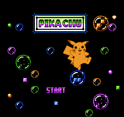 Pikachu, also referred to as "Poké Tetris", is a clone of Tengen's NES version of Tetris themed after Pokémon. The game represents player 1 as Pikachu and player 2 as Jigglypuff (who is oddly lacking hair). The Russian dancers at the end of rounds are changed to a Pikachu who jumps and spins around. The player can choose from a selection of alternate block shapes and designs. The game only features clockwise rotation of bricks (whereas Tengen Tetris also has counter-clockwise rotation). All of the music in the Pikachu versions of this game is taken from the Pocket Monster Famicom bootleg. All non-Pikachu variants use music from Kero Kero Keroppi for the Famicom instead.