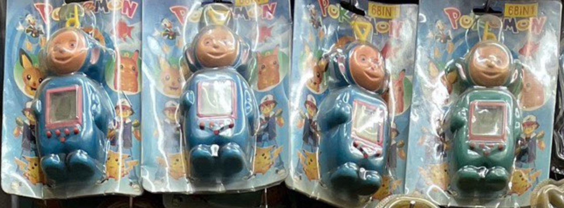 Pokémon is the name of a bootleg virtual pet handheld similar to Tamagotchi. Despite utilizing the Pokémon branding on its packaging, the virtual pet's shell is actually modeled after the title characters from the British children's show Teletubbies. It is apparently a 68 in 1. Another version known as Teletubes is only a 3 in 1.