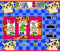 This is a simple slot machine game with most of the icons being various Pokémon, with the exception of 7's and apples with worms inside them. The Start button starts the machine while the A button stops the reels individually. Strangely, this game suffers from flicker when the reels spin.