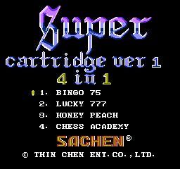 The Super Cartridge series is a series of nine multicarts for the Famicom and NES made by Sachen. These compilations are notable for containing the vast majority of the Sachen library (inlcuding the Joy Van titles) in their latest revision as well as some unique games not released standalone. They seem to originate from the mid 90s, as they only feature games from 1989-1993 (except for the few games developed exclusively for these cartridges). They do not contain any of the later Sachen titles, likely to not compete with their single-cart releases.